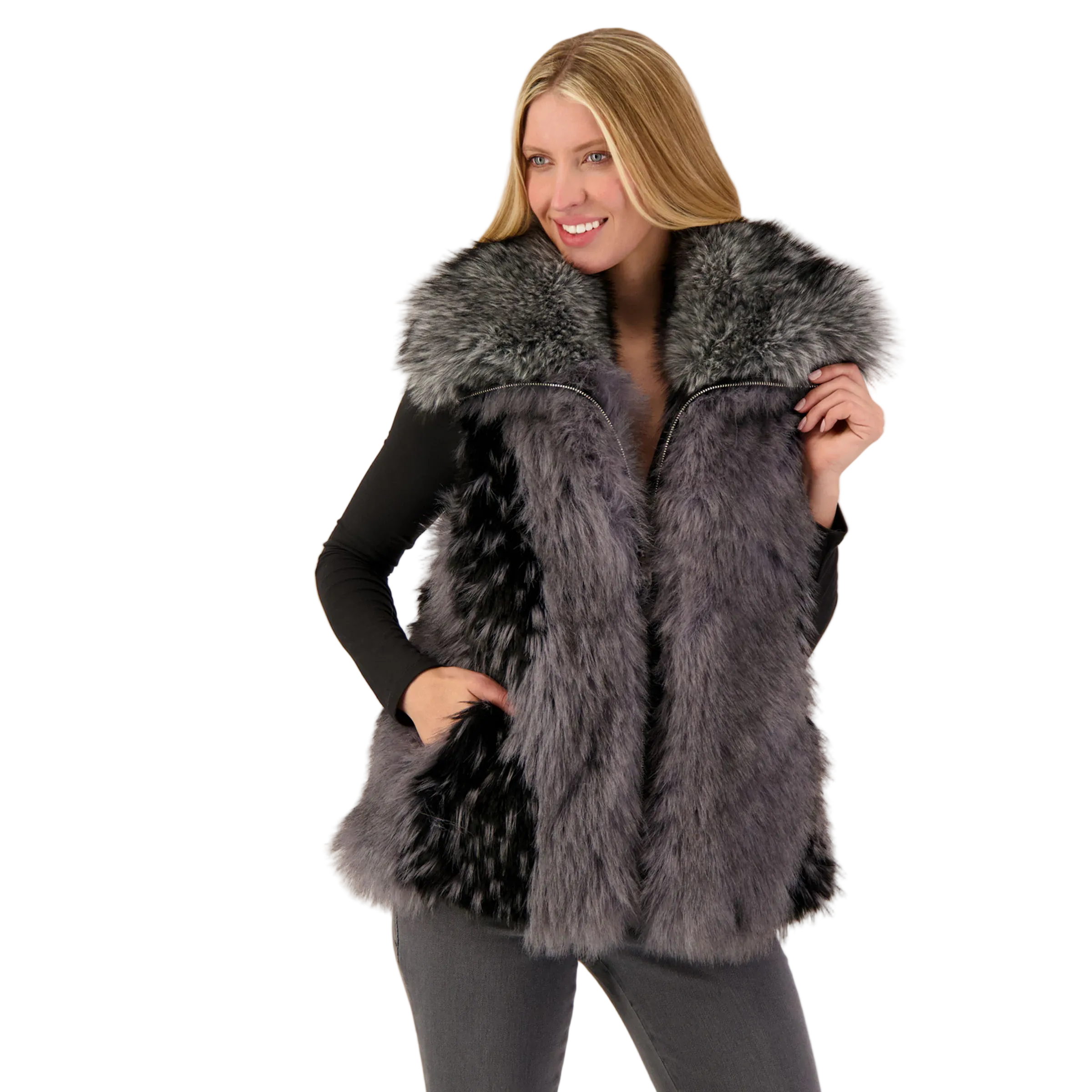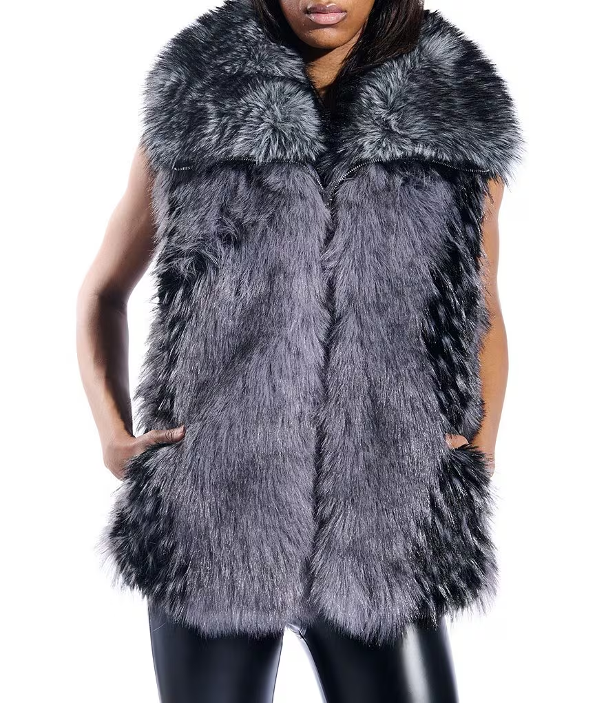 Vanesa Raccoon Pattern Faux Fur Shawl Collar Oversize Zip Front Vest Faux fur fabrication Vest silhouette Raccoon pattern Oversize shawl... Read more