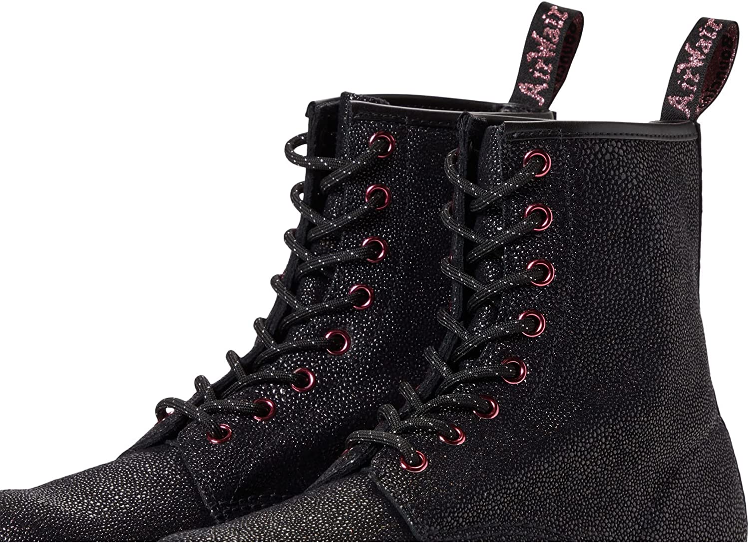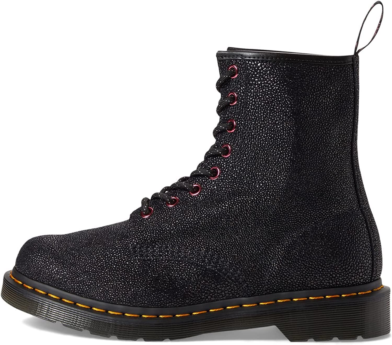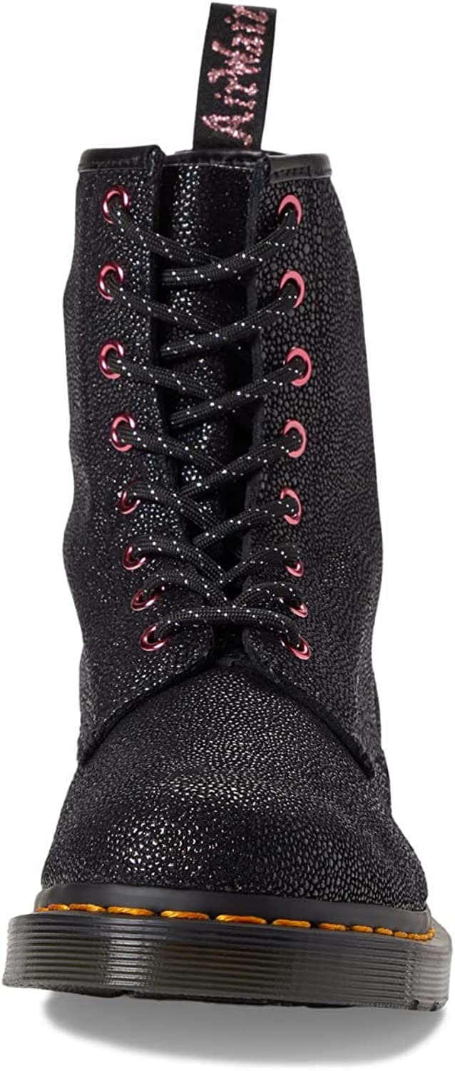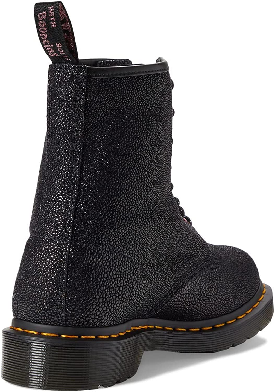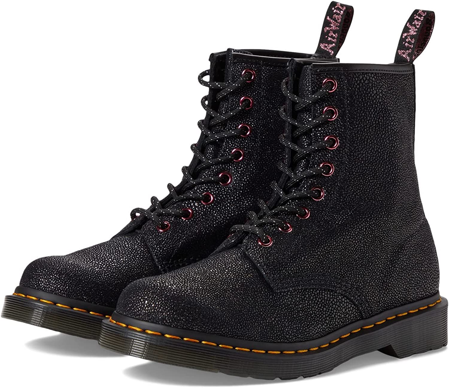Be the party. Everywhere. Our classic 1460 8-eye boot wrapped in pebble textured Bejeweled leather. All the shine of glitter with the durability of Dr. Martens. Finished with matching laces, rose gold eyelets, our unmistakable yellow welt stitch and a special edition metallic pink script heel loop.