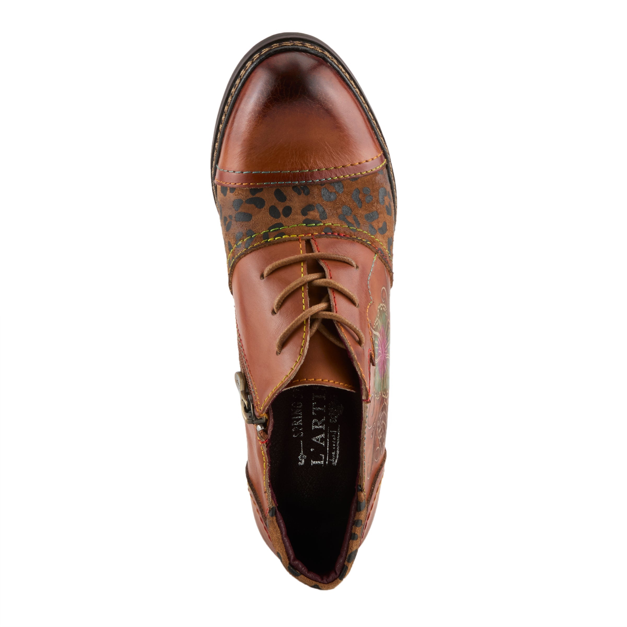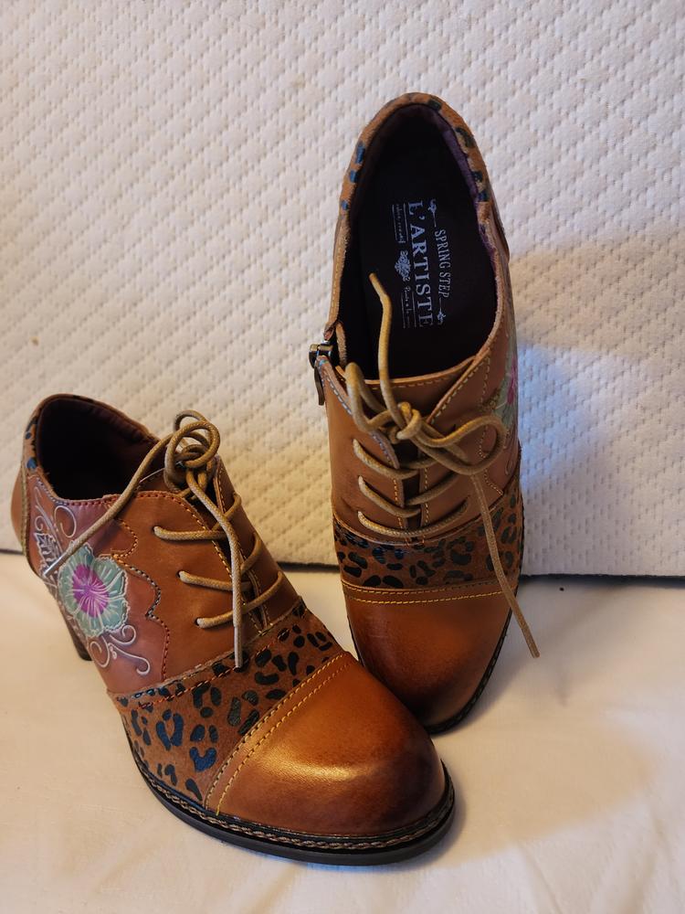 Unleash your bold and artistic side with this striking baroque-inspired lace-up oxford. Crafted from a premium leather upper, this shoe is a true masterpiece, featuring intricate floral embossing, leopard print accents, and contrast stitching for a daring yet sophisticated look. The stacked mid-heel provides just the right amount of lift while ensuring stability and comfort. A cushioned insole keeps you feeling great all day, making this shoe perfect for work, casual outings, or nights out. Elevate your wardrobe