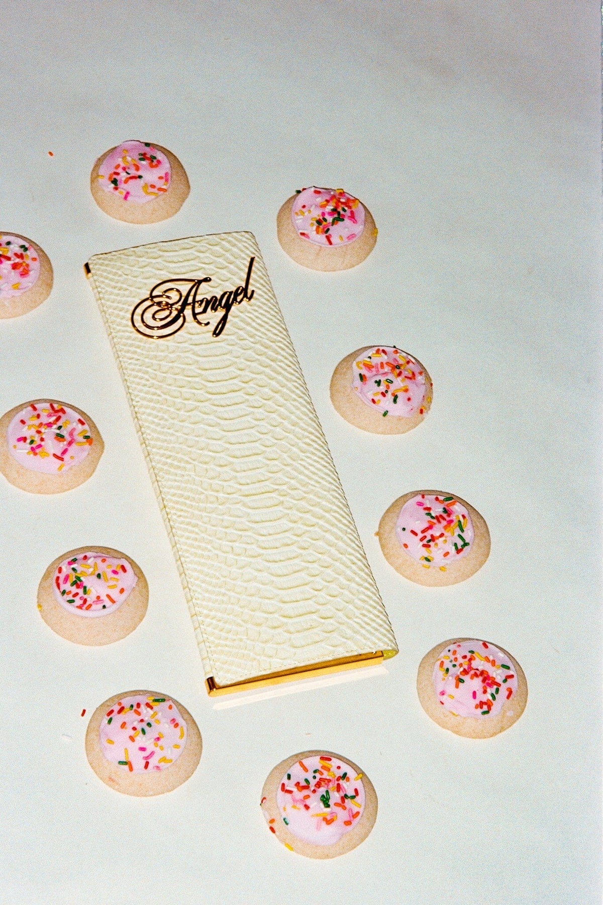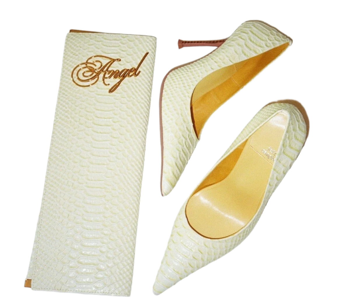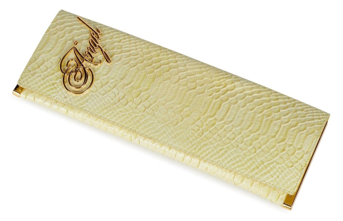 Clutch with Angel metal motif match Mule Robyn 13.5" length x 4.5" height Made of leather material Clasp closure Read more