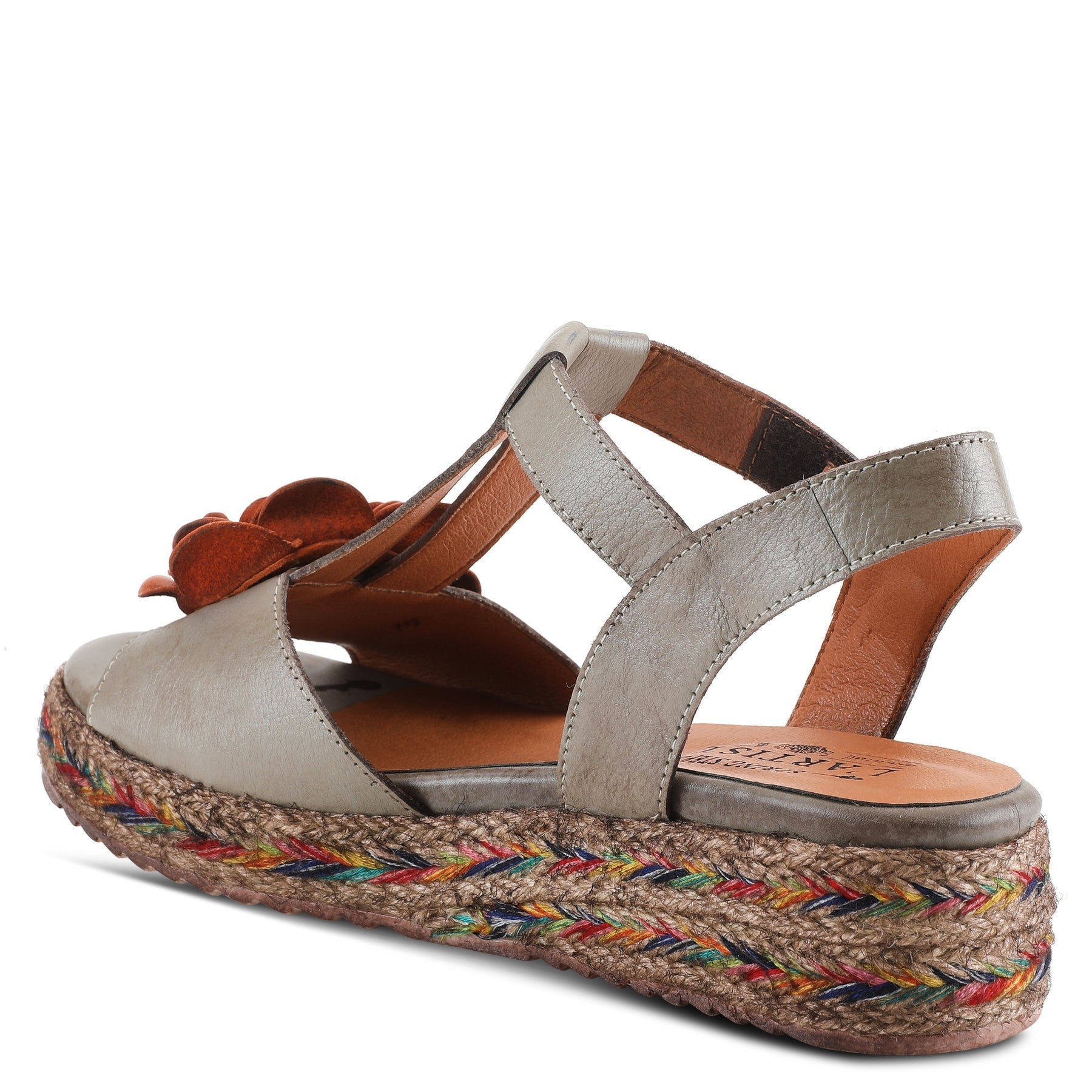 French inspired brushed leather quarter strap sandal featuring a multi-color jute wrapped wedge with an adjustable hook and loop closure ankle strap, a well padded insole and a decorative 3 dimensional flower.