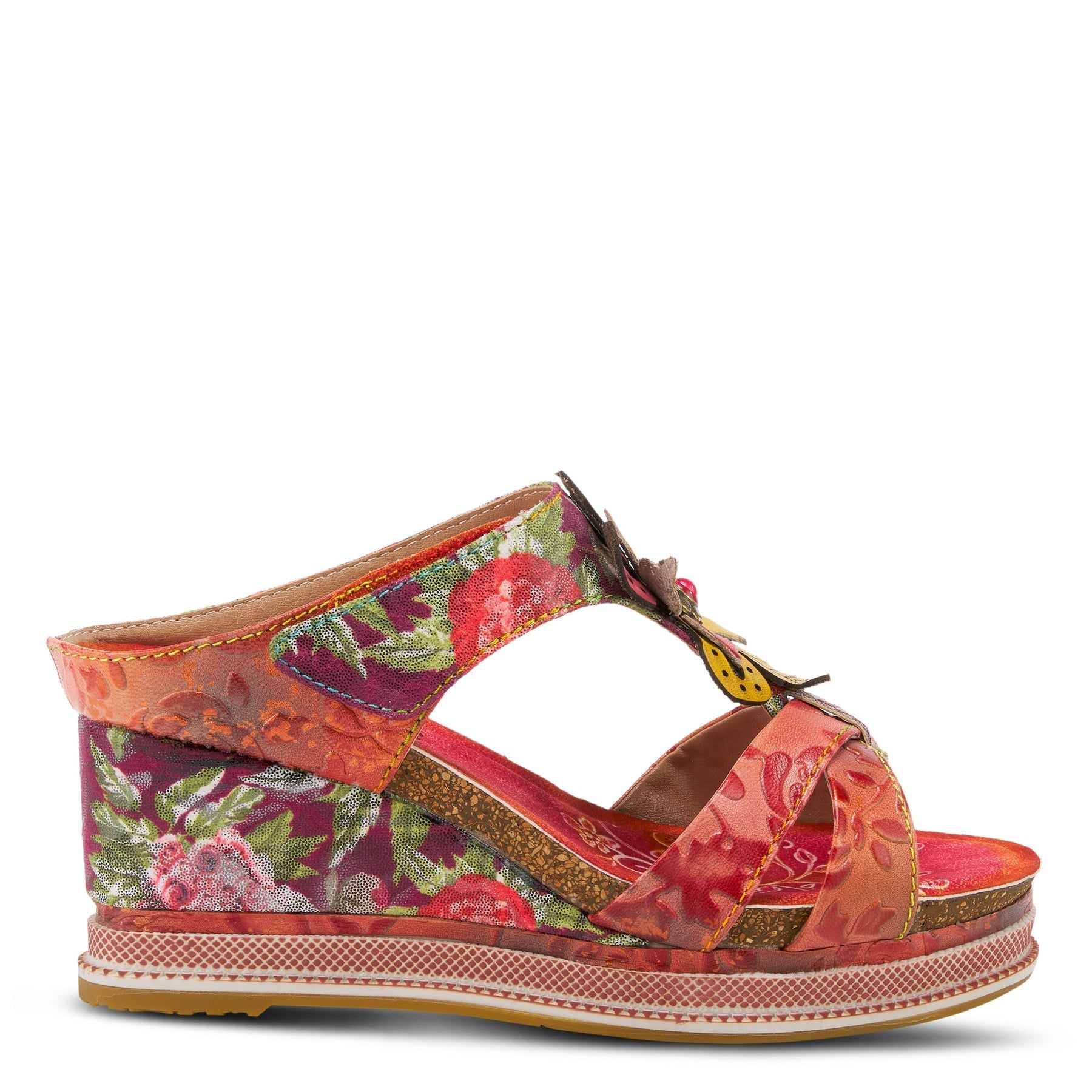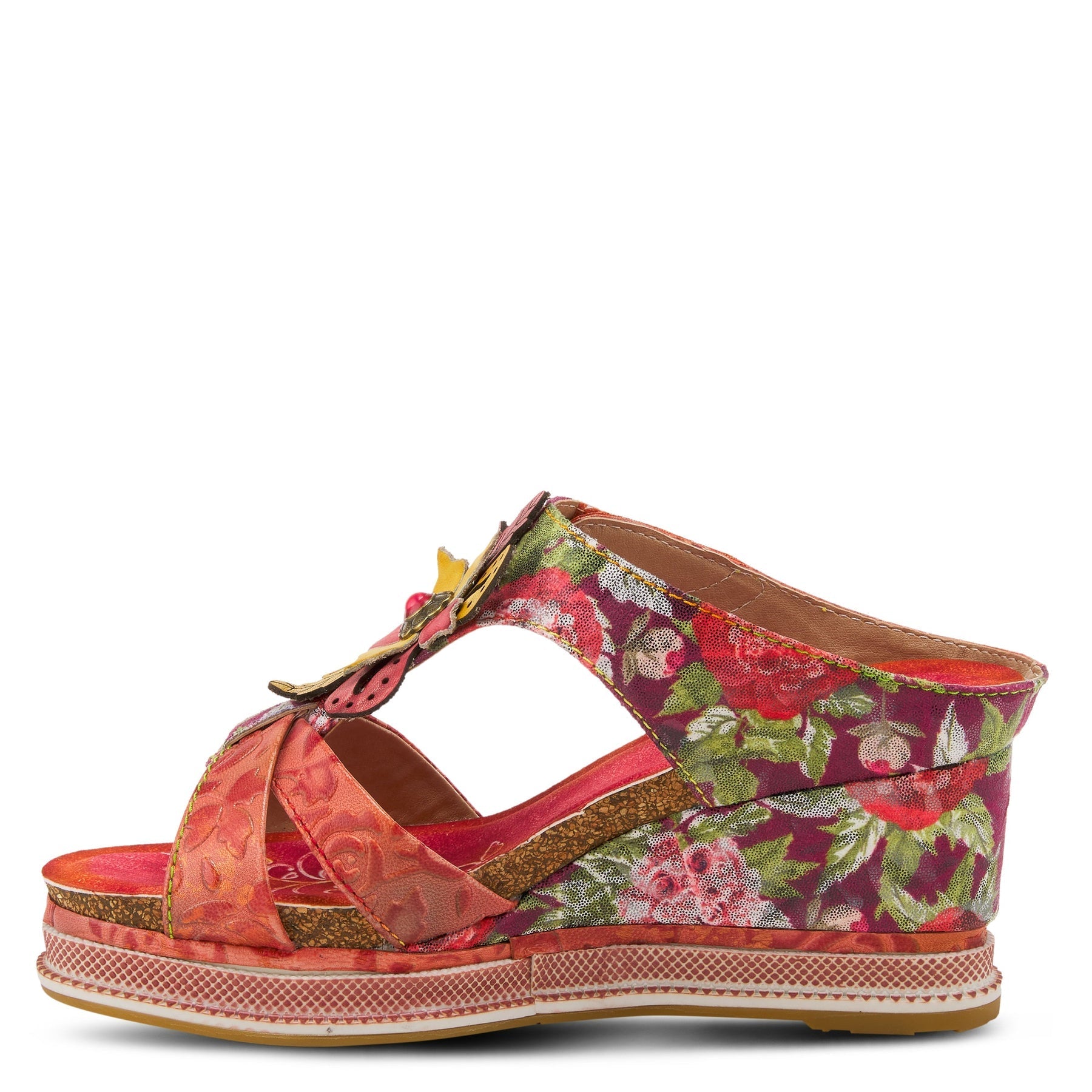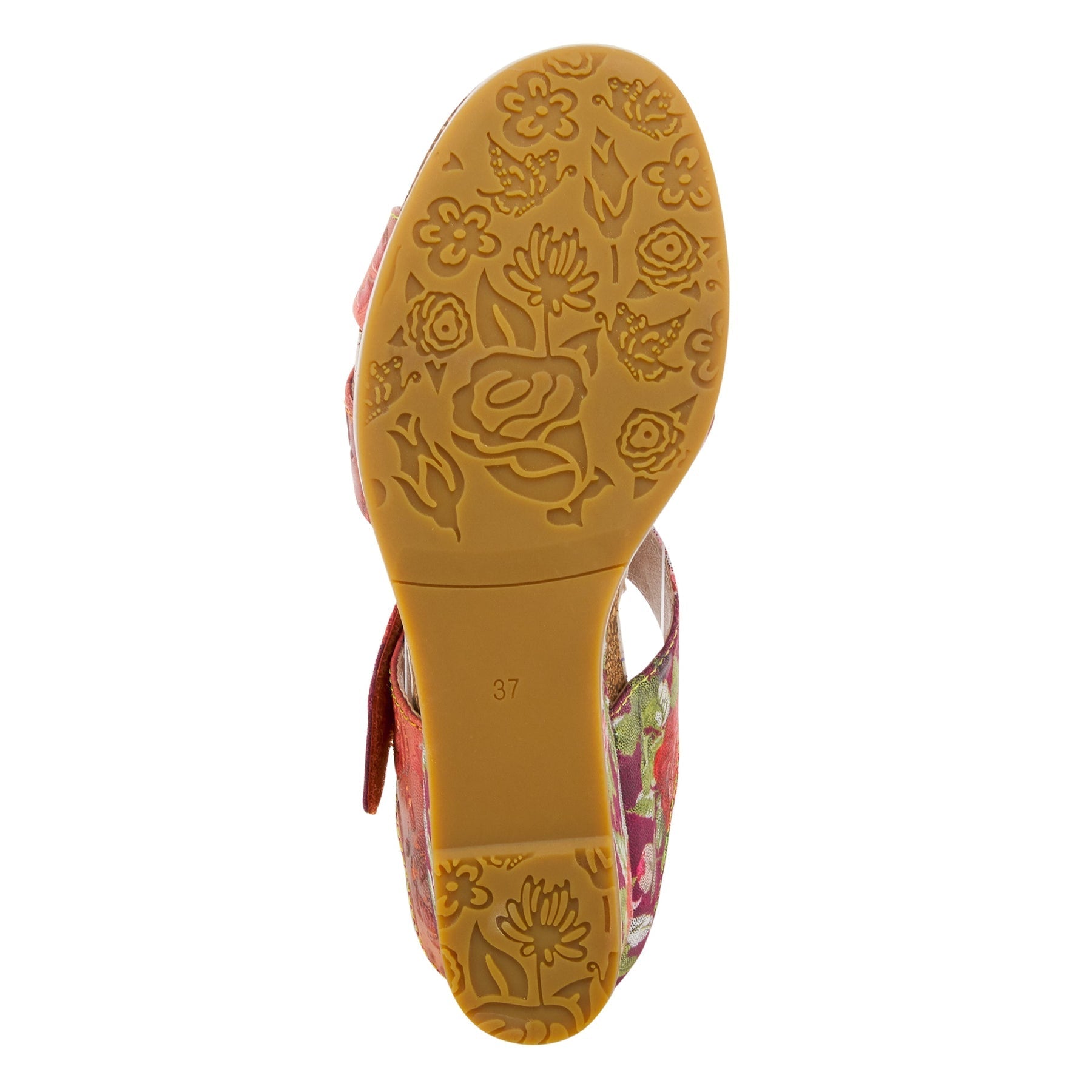 Textured welted flatform with floral and carved midsole wedge, cork infused ombre cushiony etched footbeds, and hook&loop adjustable carved leather and textile uppers with a leafy and floral proverbial "cherry on top"!