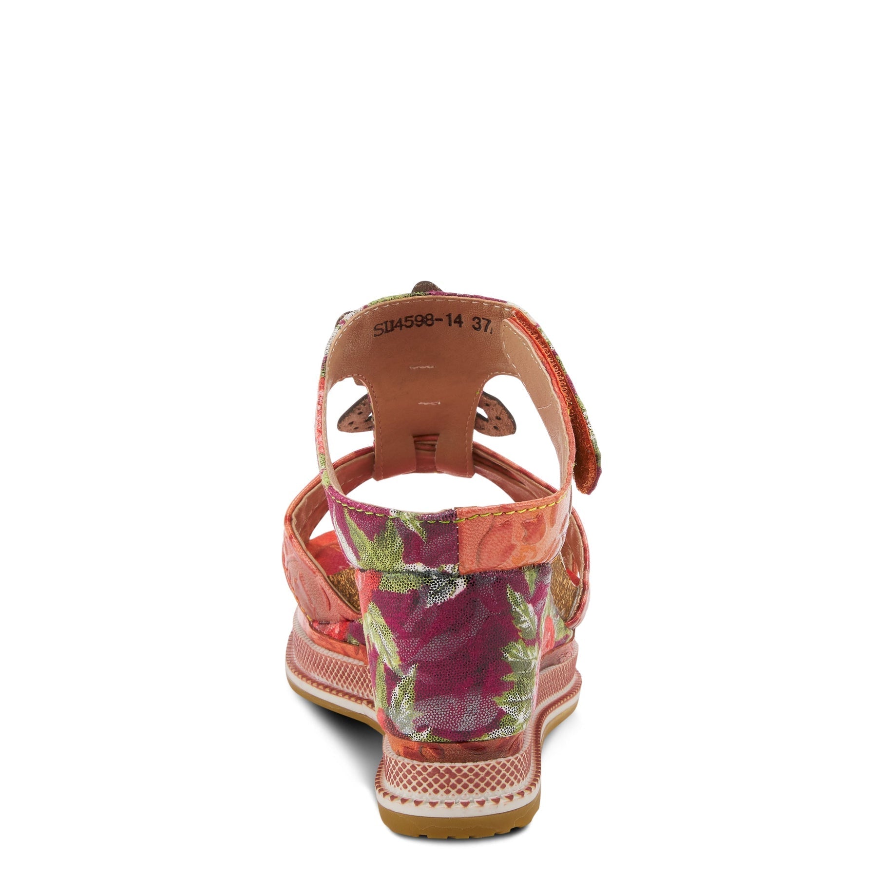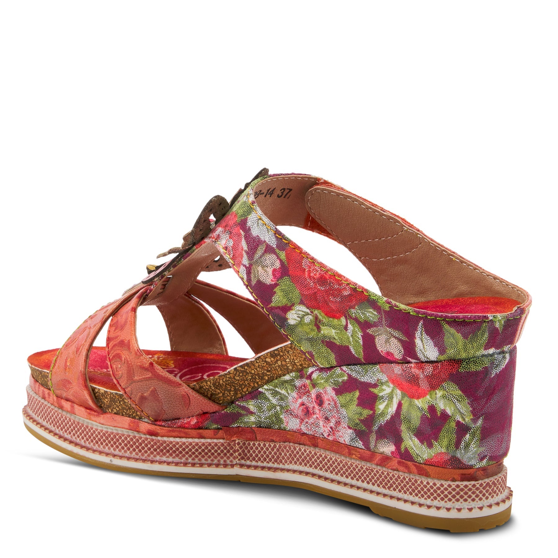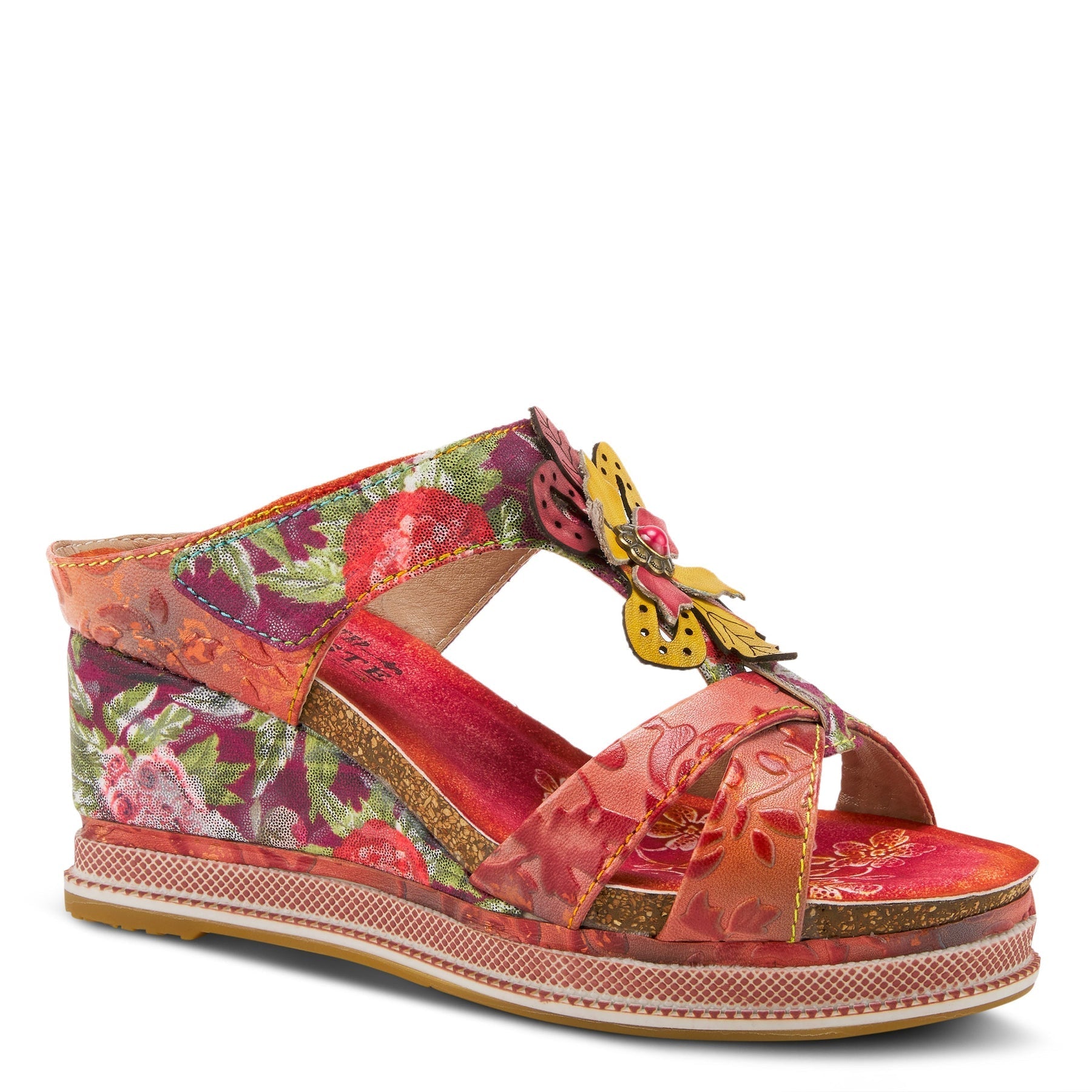 Textured welted flatform with floral and carved midsole wedge, cork infused ombre cushiony etched footbeds, and hook&loop adjustable carved leather and textile uppers with a leafy and floral proverbial "cherry on top"!