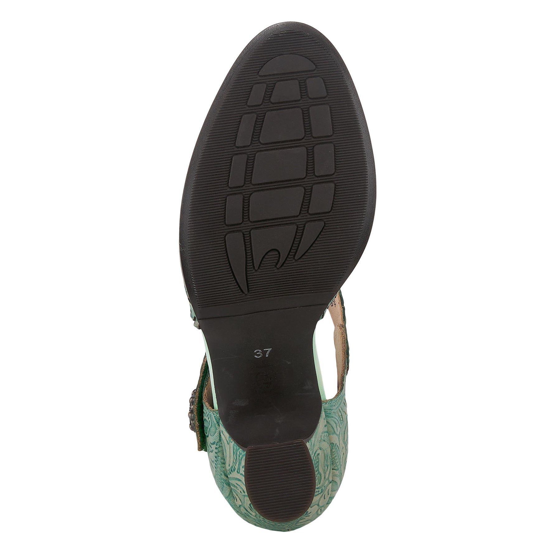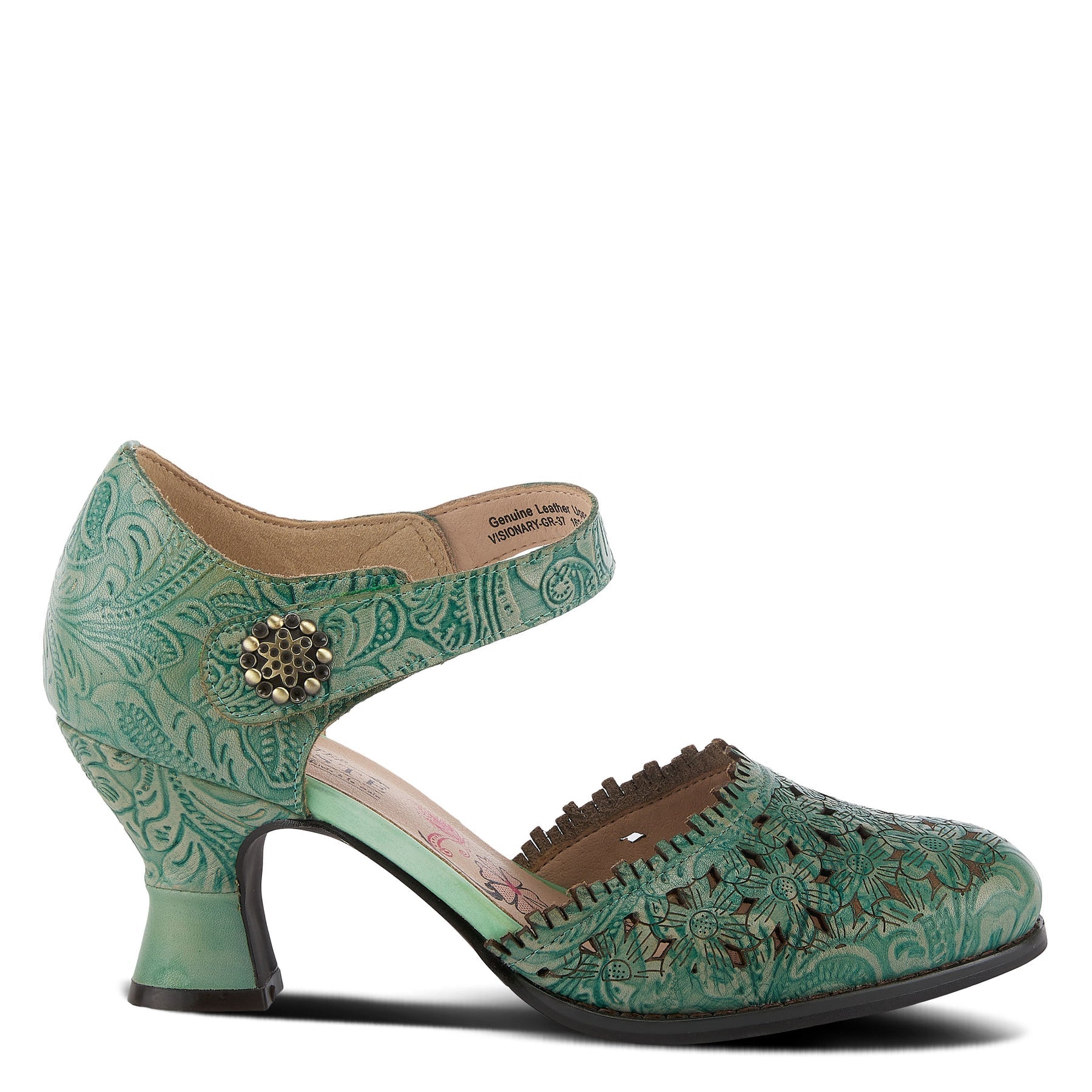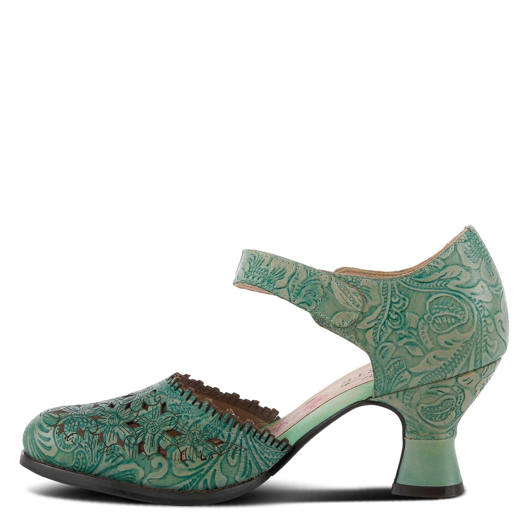 Our L'ARTISTE by Spring Step VISIONARY D`Orsay shoe is a feminine French inspired, beautiful hand-painted leather ankle strap shoe with a dainty foliage embossed pattern, floral laser etching and cutout design with a delicate fringed edge.