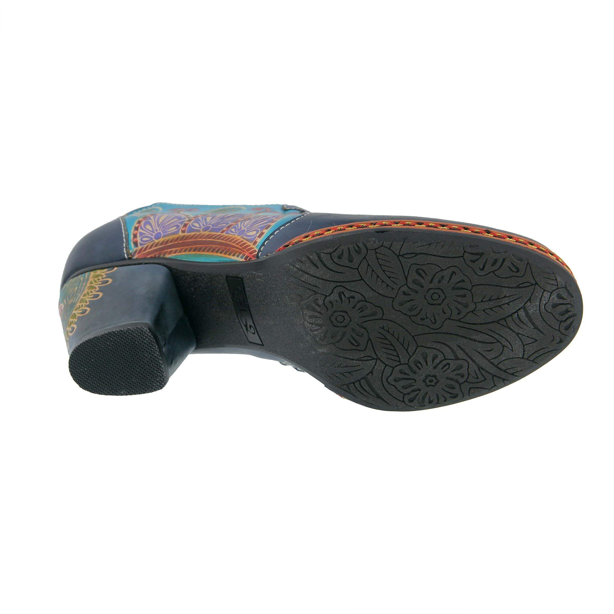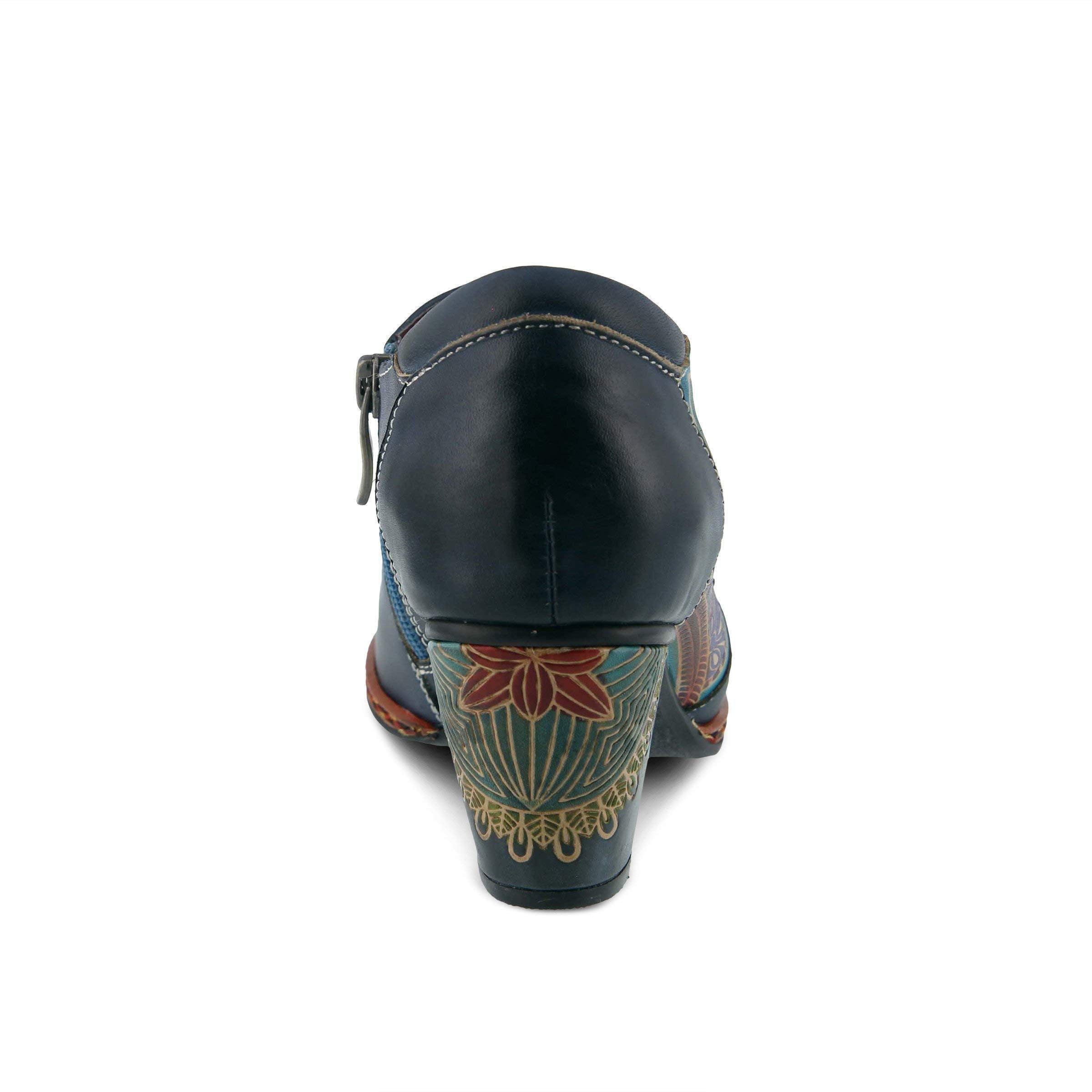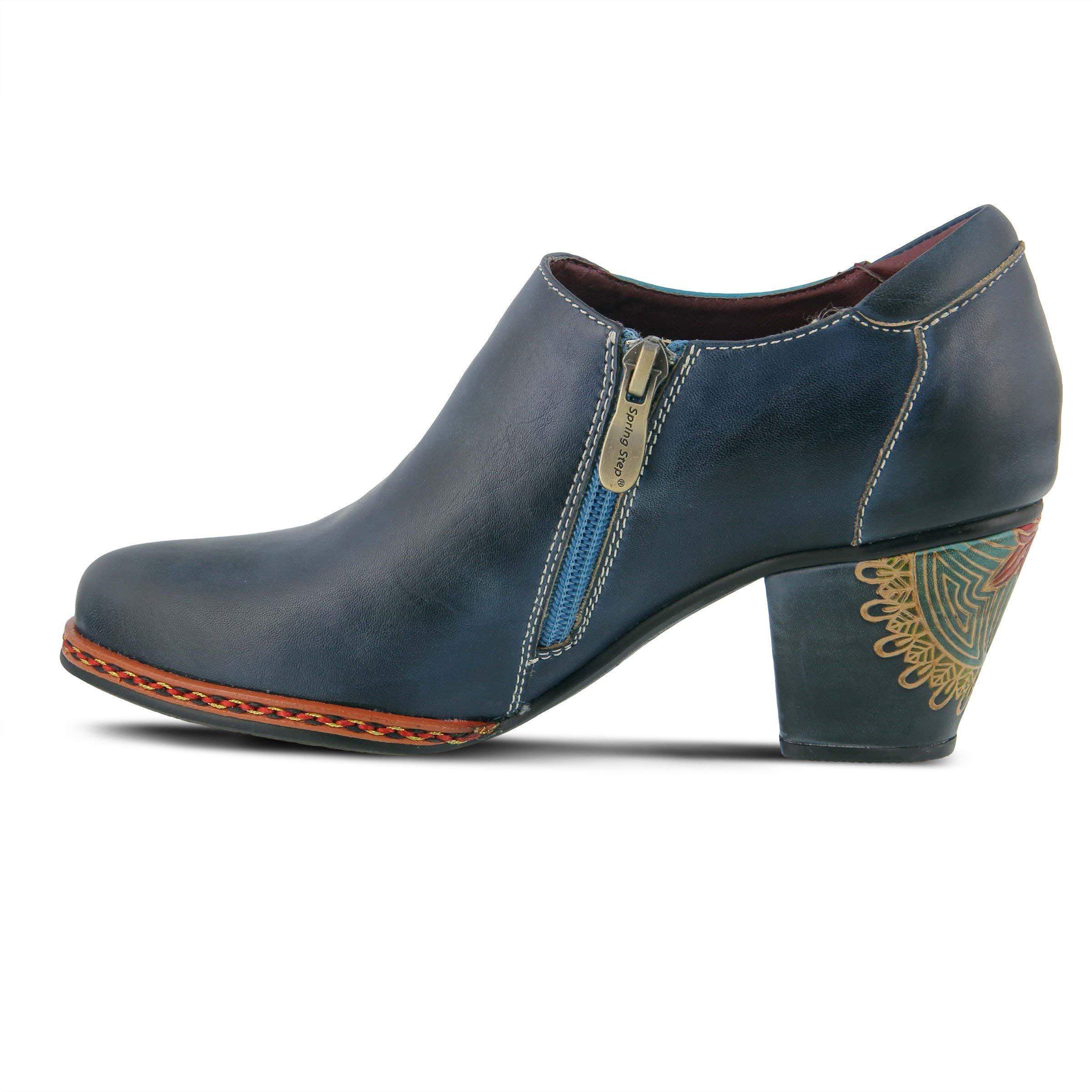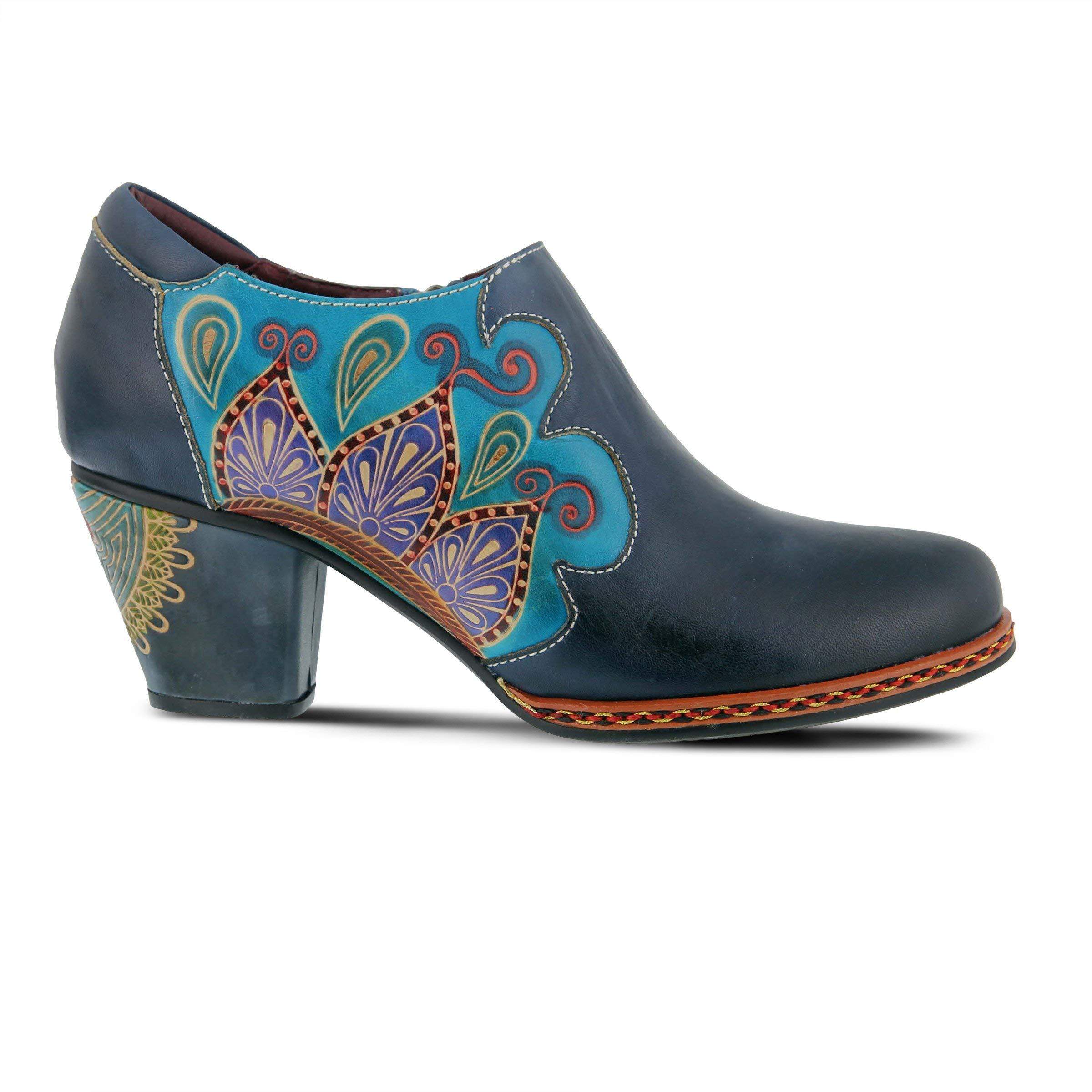 L'Artiste Style: Zami Beautiful hand painted embossed, burnished and polished leather shootie with inside full length zip and brushed metal pull tab, a padded topline for added comfort all on hand painted leather covered heel. Heel Height (approximately): 2 1/2" Platform (approximately): 1/4" Features: -Hand painted, embossed, burnished and polished full grain leather -Classic shaped round toe -Padded heel topline and full length inside zipper with brushed metal pull tab -Soft and supple synthetic leather lining -Soft and supple synthetic leather padded insole -Color matching hand painted leather-wrapped heel -Rubber outsole and double stitched welt -Imported Disclaimer: L’Artiste products are made with natural tanned leather using traditional hand painting techniques. This unique finishing process is used to create a natural effect with color variations to deliver authentic look and beauty.
