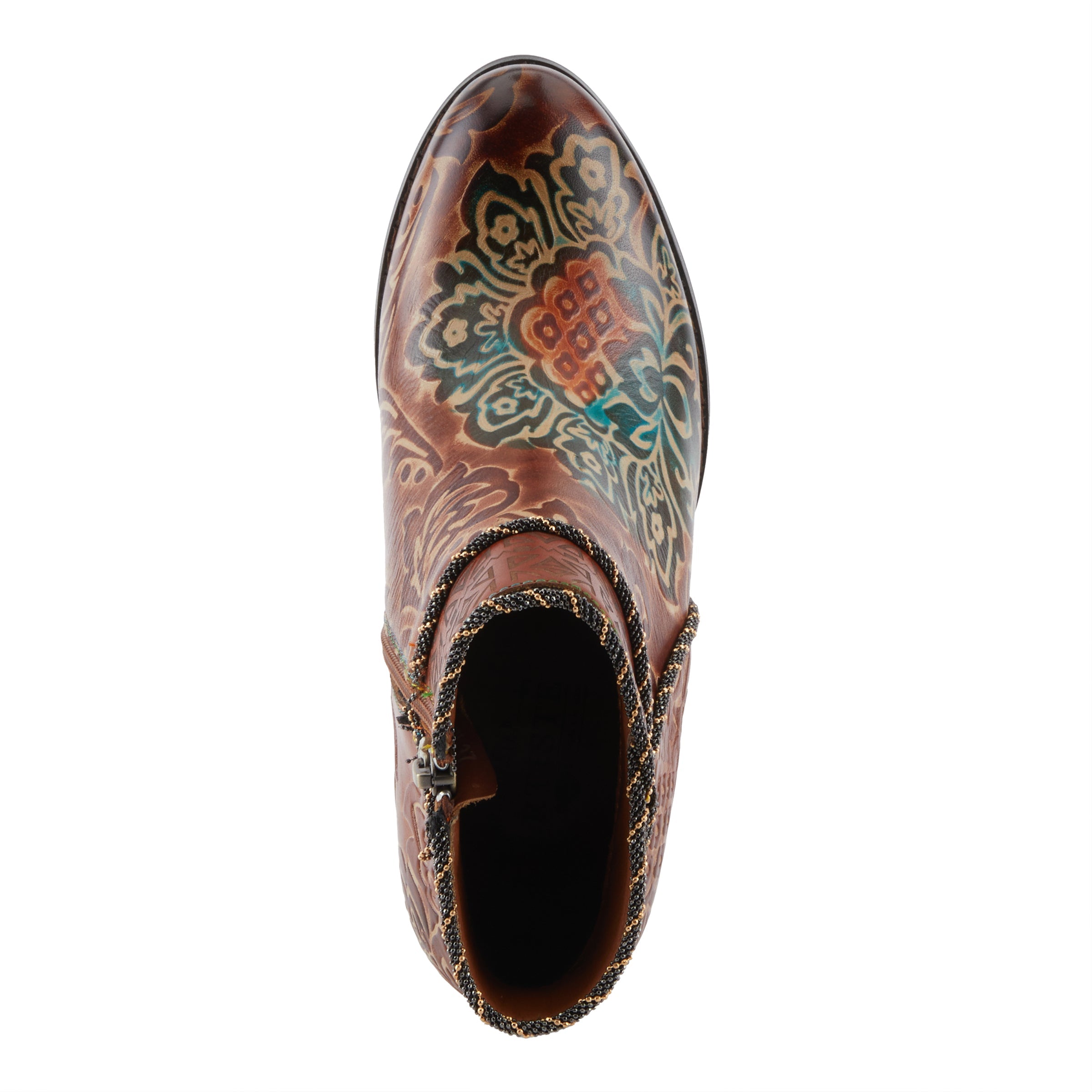 Unleash your inner artist with this exquisitely crafted ankle boot, a stunning fusion of modern inspiration and timeless craftsmanship. Featuring a premium leather upper adorned with intricate embossed floral detailing and geometric patterns, this boot is a wearable masterpiece. A sculpted mid-heel adds a touch of sophistication, while the cushioned insole ensures all-day comfort. The inside zip allows for effortless wear, making it as practical as it is stylish. Whether you're dressing up or adding a unique twist to casual wear, this boot is a statement piece for those who dare to stand out.
