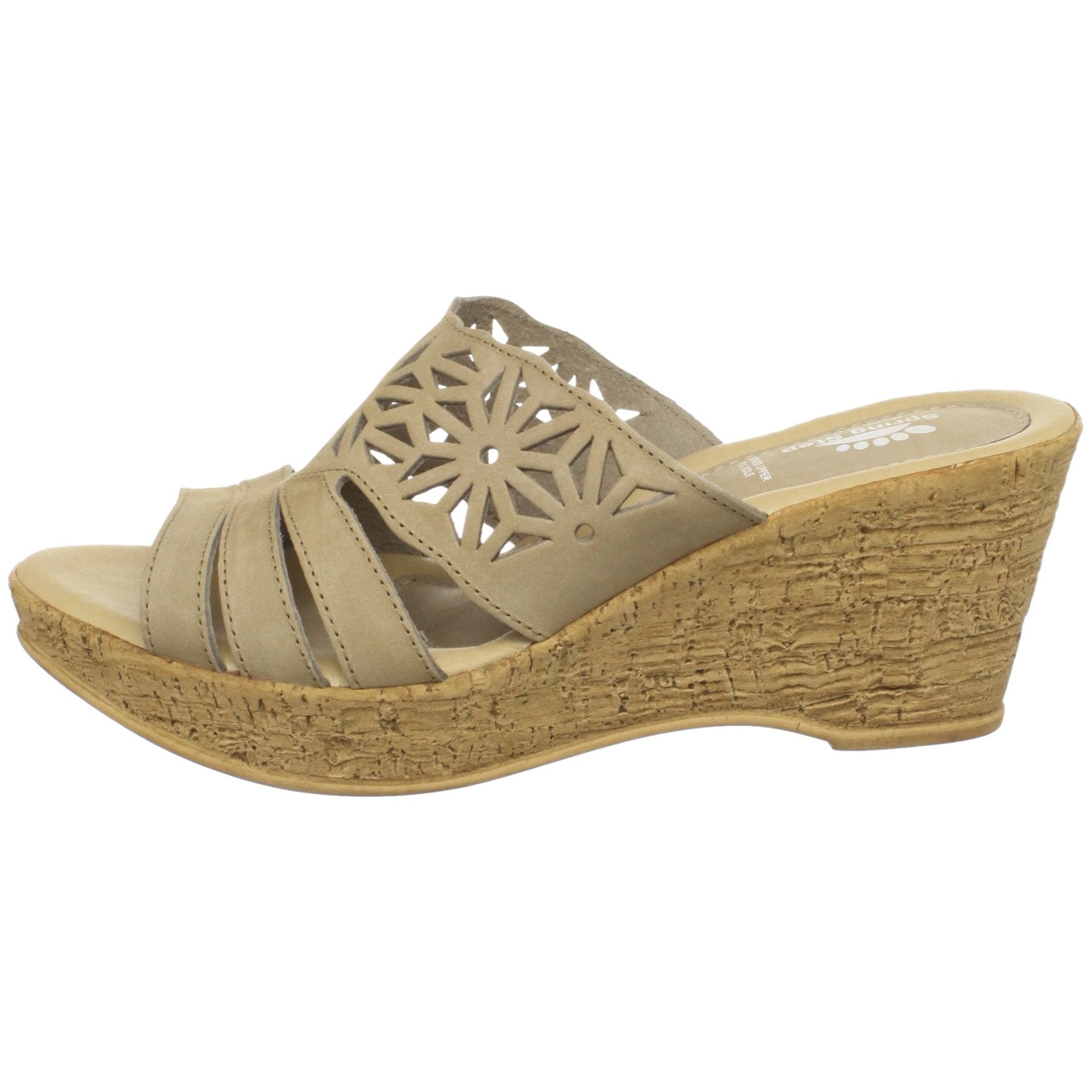 Star-shaped printed laser-cut leather slide sandal with a cork-inspired textured wedge. It's a breeze to play up your pretty pedicure in this charming women's Dora slide sandal by Spring Step. Wrapped in intricately punched leather with a snazzily scalloped vamp and open toe, the enchanting sandal brings warm-weather flair to workdays, luncheons, long weekends and wherever else your spring and summer take you. We love its 2-3/4-inch cork wedge and generously padded footbed, which pair with a 1-inch platform to evenly distribute weight for a wearable spin on leggy lift and cool, classic comfort.